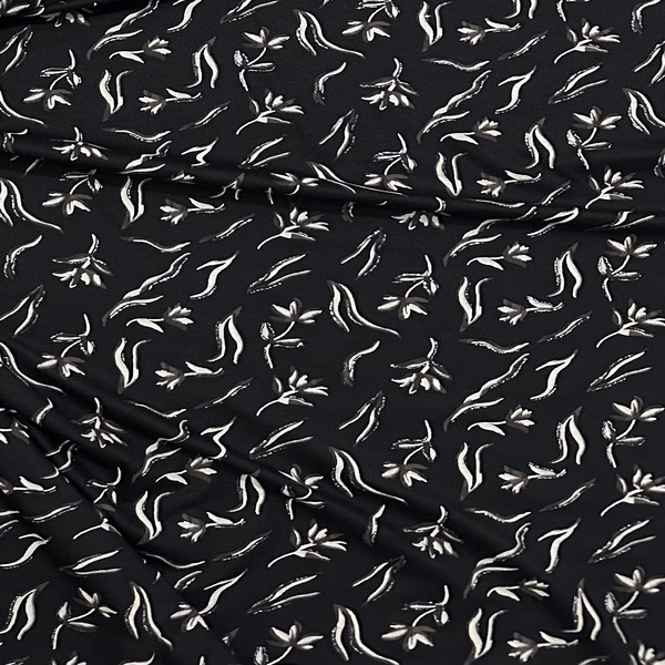 Modern ve şık tasarımıyla öne çıkan bu likralı viskon penye kumaş, siyah zemin üzerine zarif çiçek desenleri ve ışıltılı sim detaylarıyla dikkat çeker. Yumuşak, dökümlü ve esnek yapısı sayesinde konforlu bir kullanım sunar.